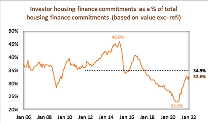 According to CoreLogic analysis, investors comprised 32.6 per cent of mortgage demand by value in January 2022, up from a recent record low of 22.9 per cent, but below the decade average of 34.9 per cent.